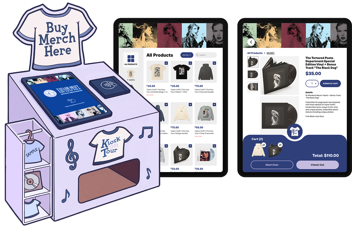 Using the Eras Tour by Taylor Swift as our hypothetical client, we created a digital and physical prototype of our kiosk. Our kiosk includes a touchscreen display for browsing and purchasing merchandise, as well as physical features such as product samples and a display case to mimic the in-person experience.