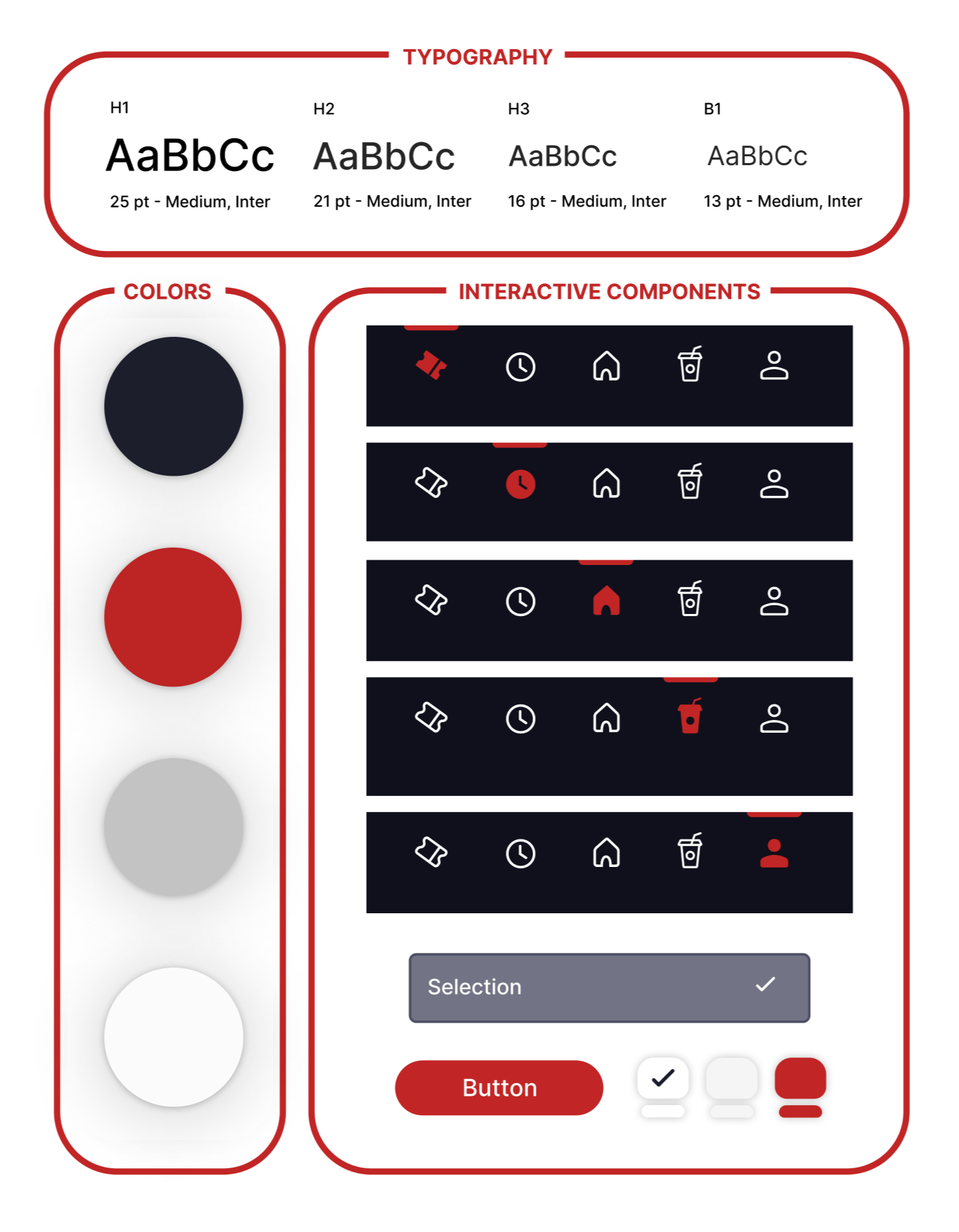 While I was creating my high fidelity prototype, I compiled the components that I used (buttons, typefaces, color schemes, etc) into a single sticker sheet.