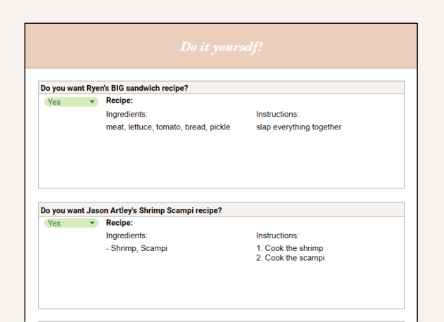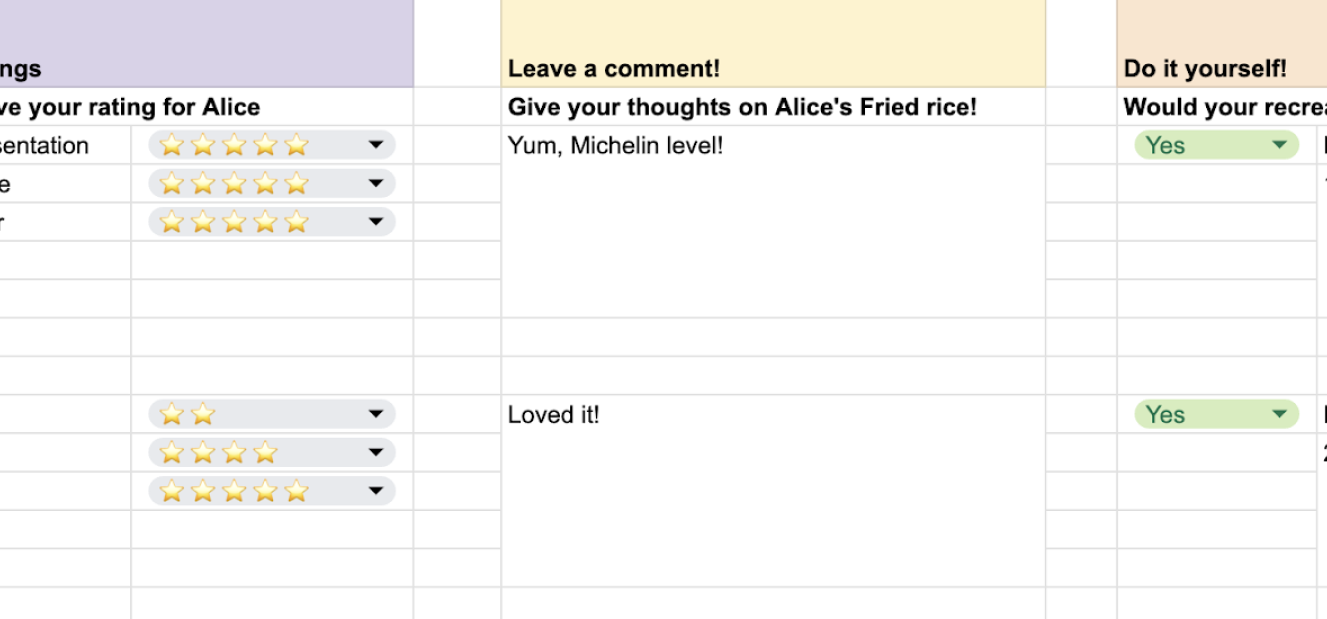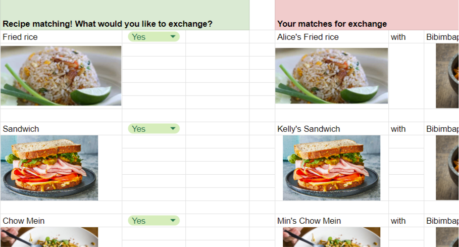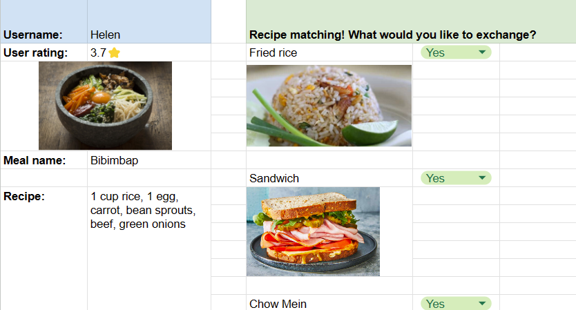 To create this functionality, we used scripting within Google Sheets to enable automatic meal matching and rating calculations.