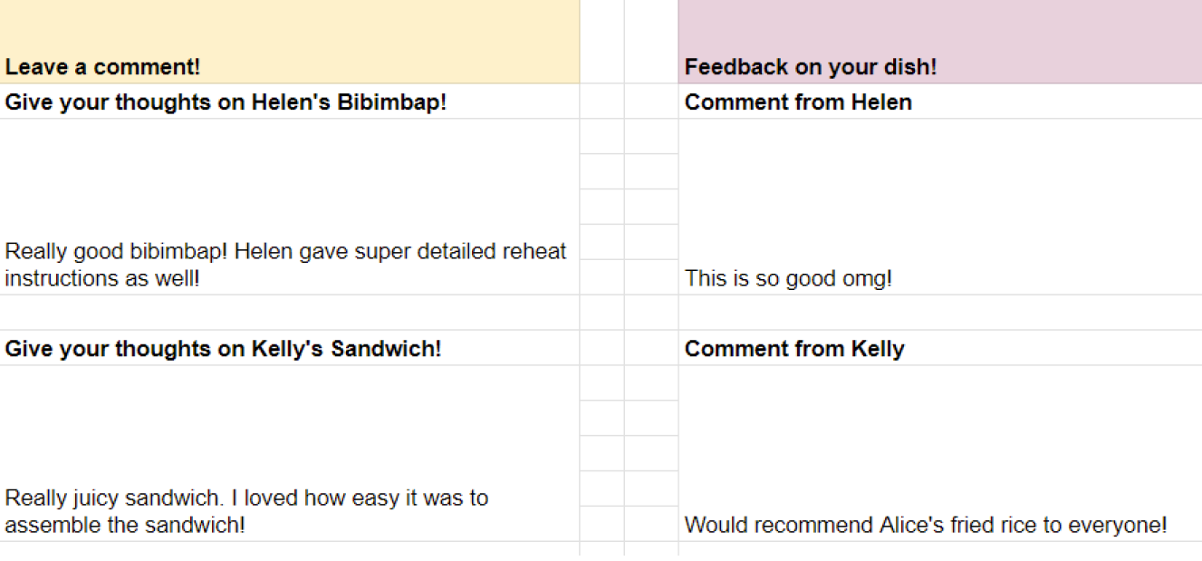 - "I think something that I would like to see is making sure that the idea takes into account that people have dietary restrictions or preferences for food. It would be really helpful especially if you have a severe allergy."