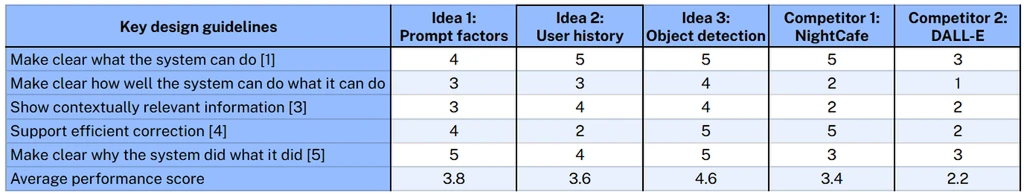 Through evaluating these concepts against existing solutions, we validated our ideas and identified the most promising directions. This analysis helped us refine our approach to tackle user pain points that current tools weren't addressing. Using the Human-AI Interaction Guidelines from CHI 2019, we strategically assessed our concepts' strengths and weaknesses on a 5-point scale.