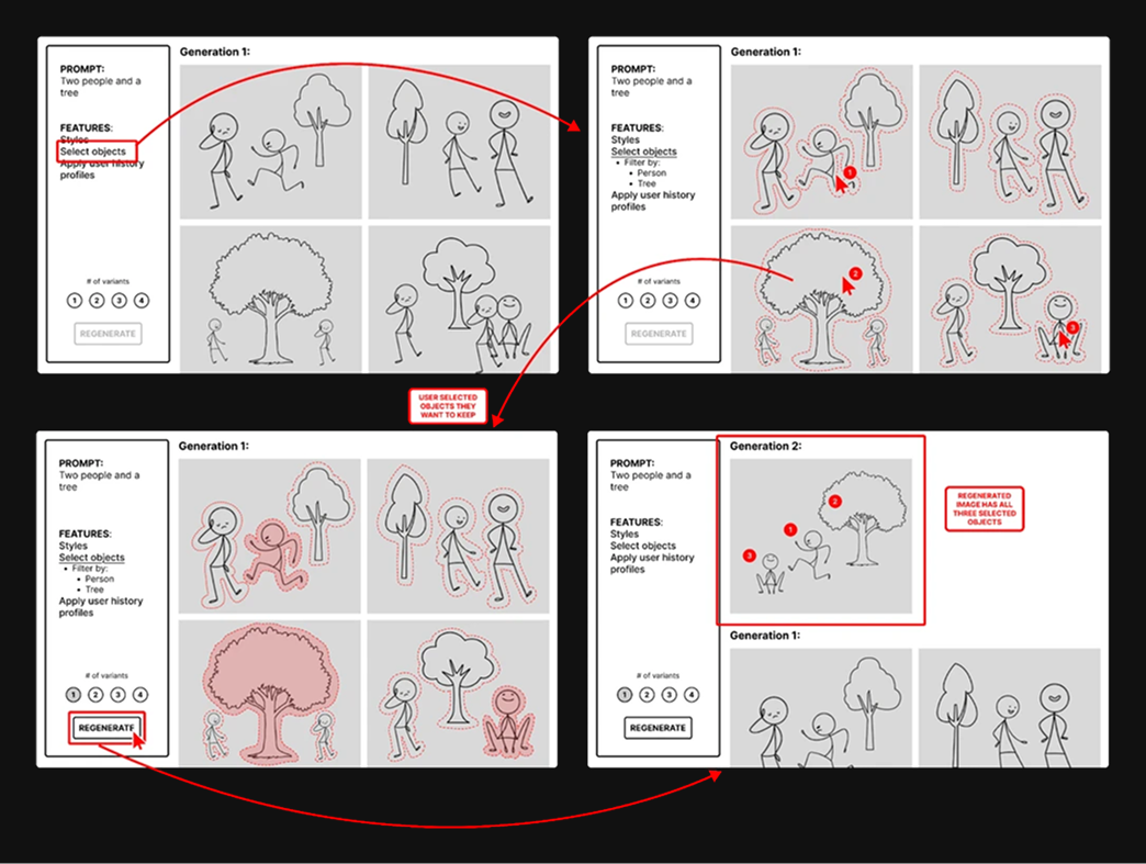 Combining objects for regeneration. After activating the "Select objects" tool, users can choose and combine elements from various AI-generated images. These selected objects are then used to create a new, customized version with a single click.